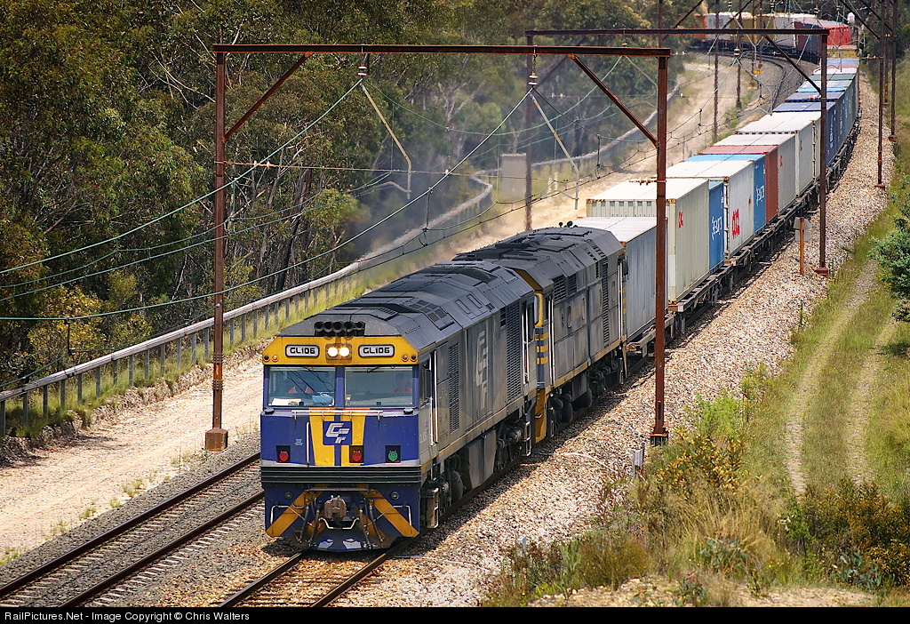 GL106 leads 44204 west near Bell with a late running container train from Port Botany (Sydney) to Blayney. GL106 was among 12 GL Class Goninan/GE CM30-Mmi locomotives built between 2002 and 2004, using the frames, bogies and fuel tanks of former NSW Railways 442 Class Goodwin/ALCo units...of which 44204 is a surviving example.