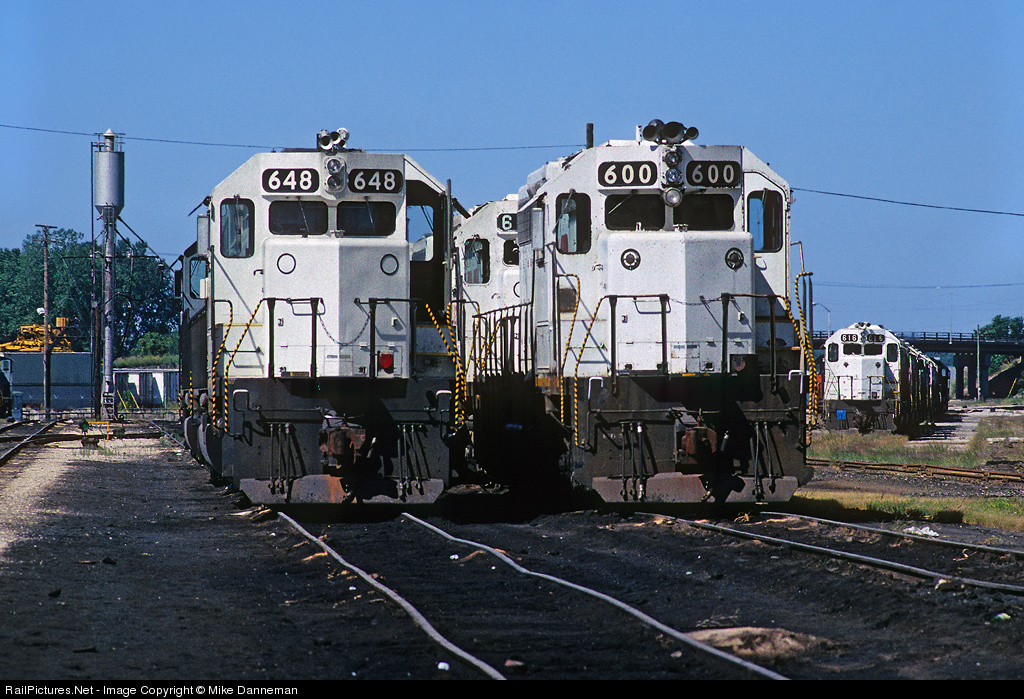 White Kansas City Southern EMDs gather at Knoche Yard in Kansas City, Missouri on September 14, 1990. KCS Nos. 600 and 616 on the right are SD40s, while No. 648 is an SD40-2.