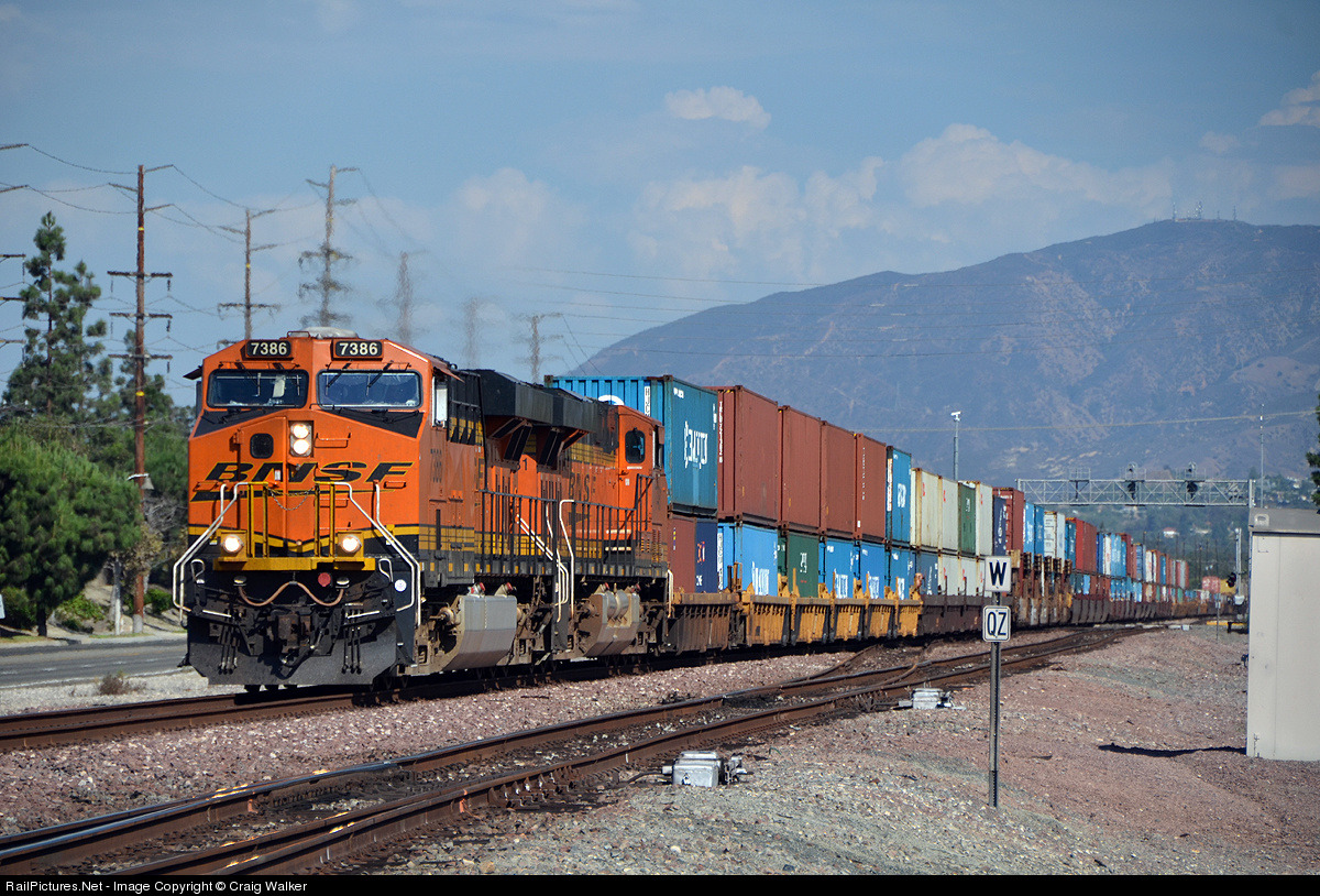 At the western portion of BNSF Railway's Transcon line between Chicago and Los Angeles, train S-LPCLBJ1-05A (Intermodal Stacks; originating at Logistics Park in Chicago IL headed for Pier J at the port of Long Beach CA) hustles through Atwood (the old Santa Fe station name which is now part of Placentia), California. ES44DCs 7386 and 7481 are on the headend, and ES44DC 7443 and ES44C4 6848 are the rear Distributed Power Units (DPU), pulling a long string of well cars loaded with containers. (The QZ on the Whistle Post sign indicates that this is a "Quiet Zone" and the train is not allowed to whistle for grade crossings, as it upsets the delicate sensibilities of the NIMBYs who live alongside the mainline.)