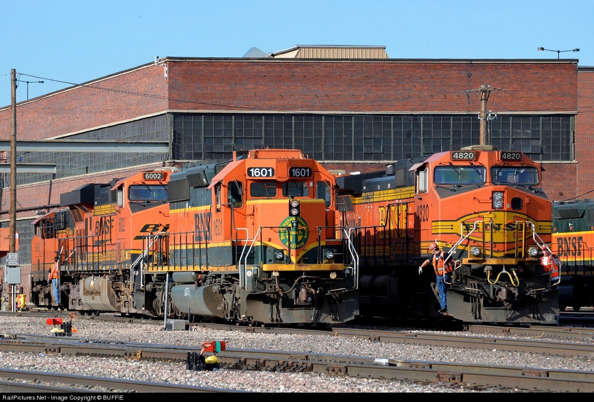 | Coming and Going. BNSF 1601 (SD40-2) and mate back into the fuel island for servicing while BNSF 4802 (Dash944CW) and team head out to the Denver yard to connect with a freight that is ready to depart. |