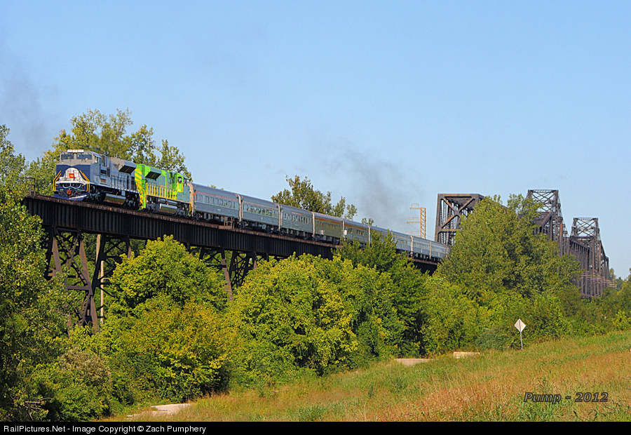 The 9 A.M. run of NS Train 099 crosses the Wabash Missouri River Bridge led by the the WAB and ITC Heritage Locomotives.