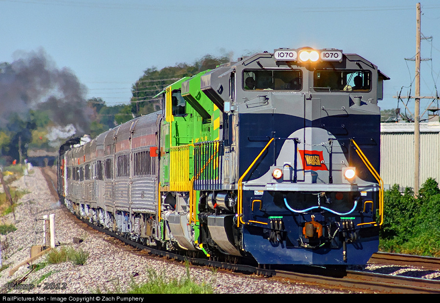 The 9 A.M. run of NS Train 099 is on the final approach back into Berkeley past Lambert Airport behind the WAB and ITC Heritage Locomotives.