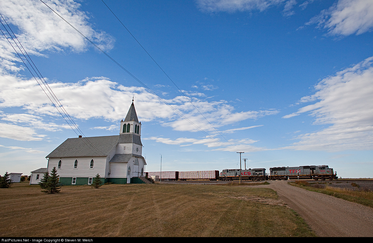 A Mexican leader is in charge of an extra manifest from Pasco, WA to Northtown, MN while passing the Little Prairie Lutheran Church.