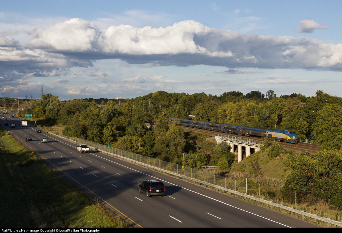 | Ominous looking clouds fill the sky as VIA 75 continues it's journey westward after a station stop at Aldershot, running along the Oakville Subdivision adjacent to highway 403 and catching some golden evening light. |