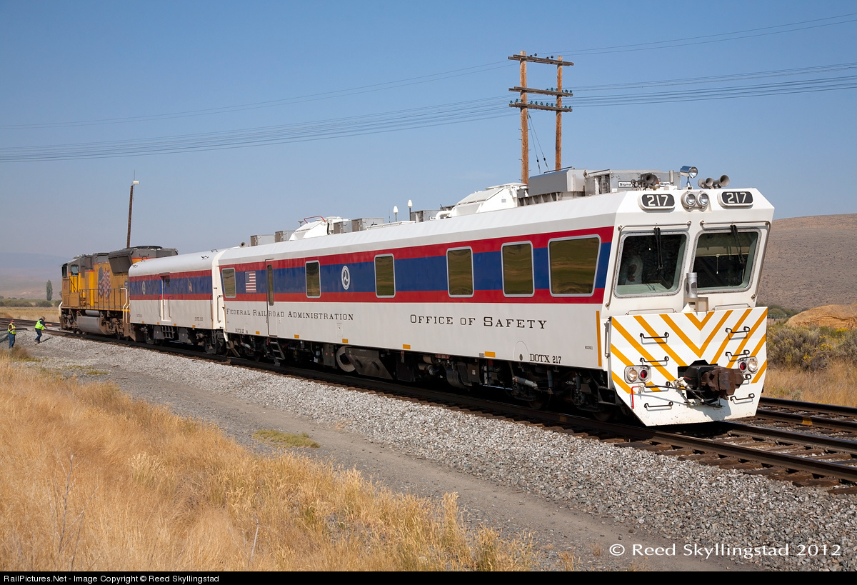 DOTX 217, a track geometry car waits for an intermodal train at North Powder. This complex car can be operated by itself or towed behind another locomotive. In this case, Union Pacific SD70M #4917 leads it to La Grande, OR where it will tie down overnight.