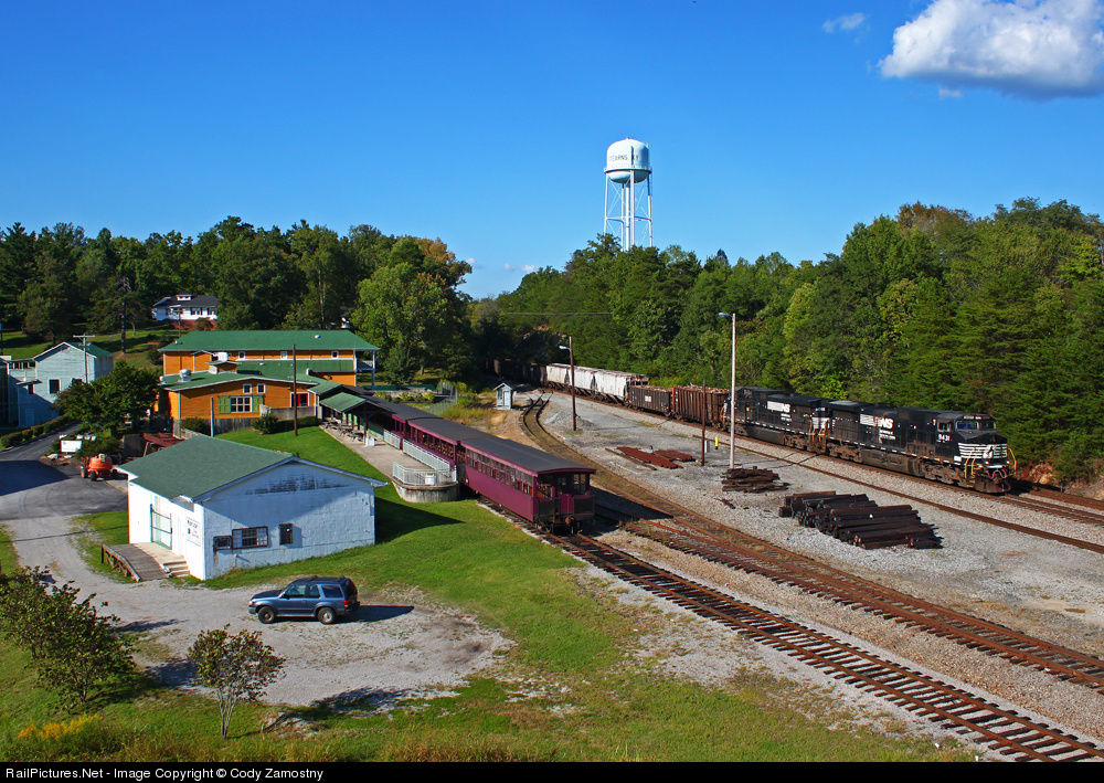 Mixed freight 117 blasts past the loading platforms for the Big South Fork Scenic Railway in downtown Stearns. The scenic railroad takes passengers to an old abandoned coal mine west of town while Norfolk Southern continues revenue freight operations on the Southern Railway's "Rathole."