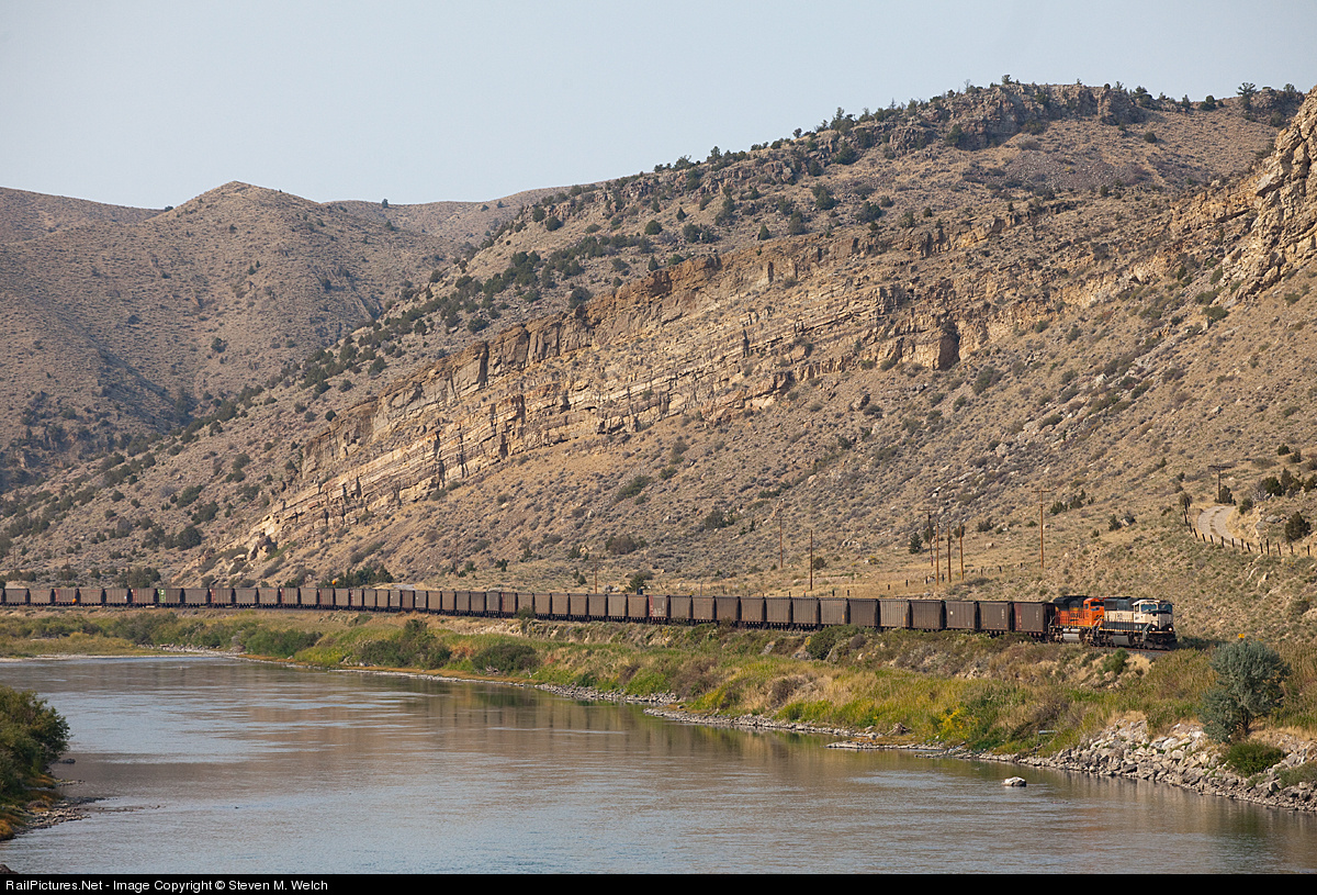 | Gliding along the Mighty Mo, two EMD's handle an empty Centralia, WA to Spring Creek Mine coal train through the impressive Lombard Canyon. |