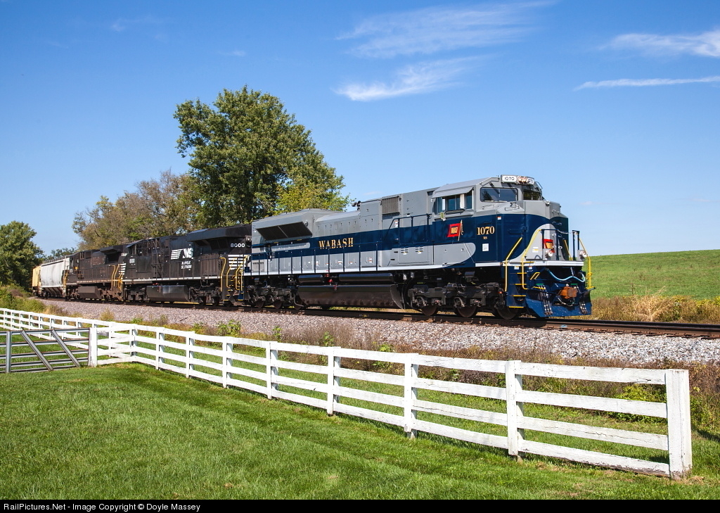 The Wabash heritage unit leads 111 eastbound through central Kentucky farmland.