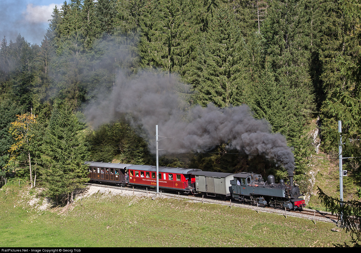 Association "La Traction", based in Pré-Petitjean in the swiss Jura mountains on the Jura Railways (Chemin de fer de Jura, CJ, 1 meter gauge), owns two Mallet steam locomotives, both purchased from the CP in Portugal. The little smaller engine G 2x2/2 (0-4-4-0) E 164 is accelerating her train after a stop with a simulated train robbery by 4 "bandits" on horses in the middle of the forest.