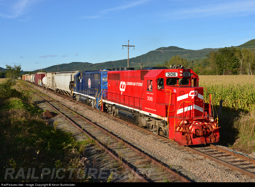 | CLP GP40-2 306 and VTR (Washington County RR) painted GP38-2 202 lead a southbound NPWJ (Newport-White River Jct.) train through Ryegate on a crisp early fall afternoon (September 19) with a hefty cut of traffic cresting the grade and onto the downhill side toward White River Jct. |