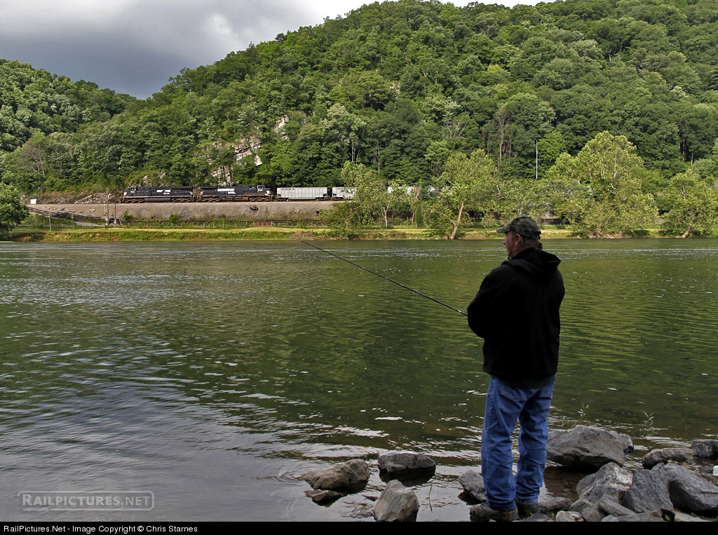 | A pair of NS GEs lead an eastbound loaded export coal train along the New River at Robinson, VA as a fisherman tries his luck early on a Summer morning. |