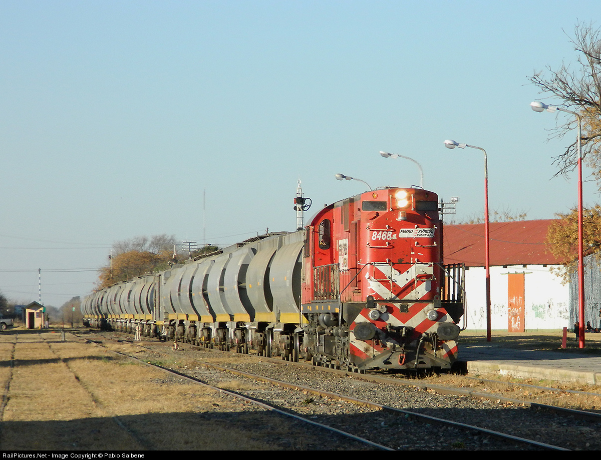 | Freight train, with the ALCo RSD-16 #8468 and 30 grain hoppers, arriving at Trenque Lauquen for a quick stop before continue the trip to La Pampa. |