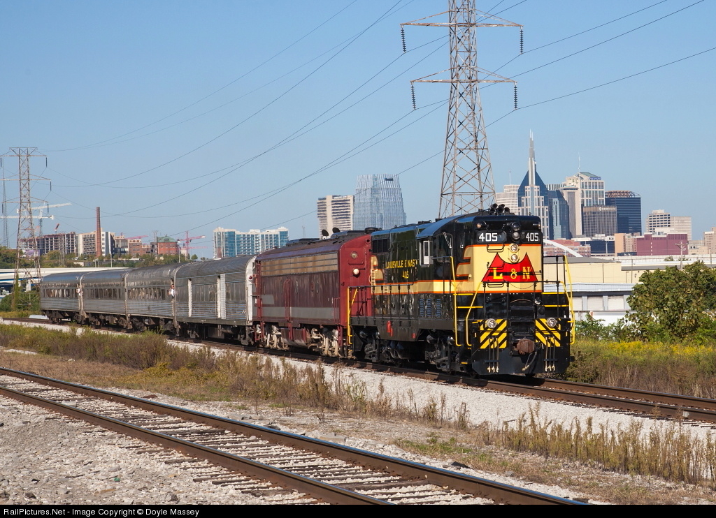 Louisville & Nashville GP7 405 leads the L&N Historical Society convention train with one of its namesake city skylines in the back ground.