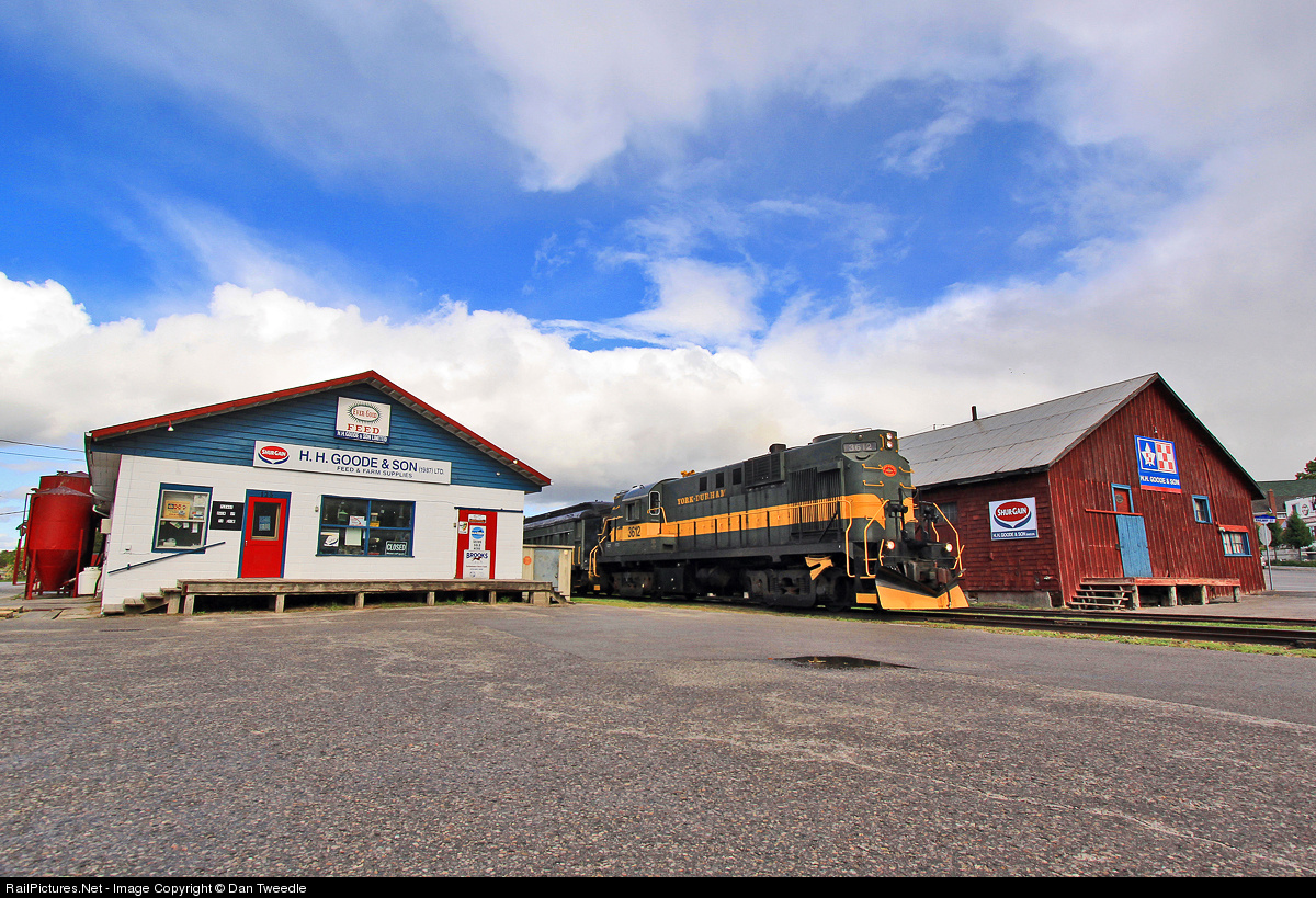 Just like the days of the old: An Alco RS11 splits the property of H.H. Goode and Sons Feed and Farm Supplies in two as it departs Uxbridge Station for a Sunday excursion.