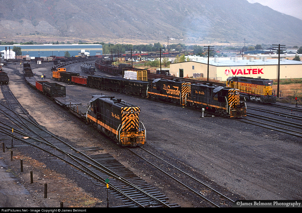 Here's a tripple play at Provo Yard . . . While Rio Grande's afternoon yard switcher goes about its duties on the drill track, a Geneva Steel mill turn enters the westward main track, through the electric lock hand throws. Meanwhile, Union Pacific's Geneva turn departs Provo at the precisely the same time. I can't help but wonder even today, which train got to the Lakota crossing first. Anyhow, I was a 16 year old kid at the time, riding my Azuki 10-speed bike across the University Avenue viaduct when I shot this Kodachrome 64 view on a rainy October '77 afternoon.