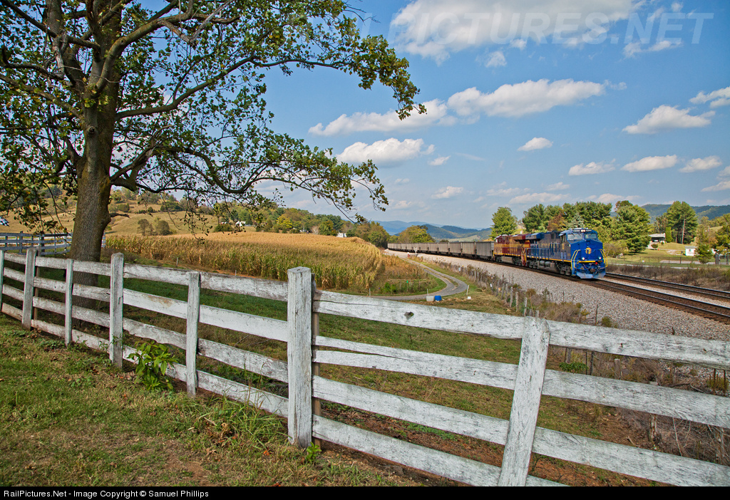 | On a absolutely gorgeous afternoon in the quaint community of Shawsville, VA, NS 759 wastes no time as he negotiates the steepest section of Christiansburg Mountain with the N&W and PRR heritage units doing the honors.. The N&W engine looks right at home in such a pastoral scene situated along the railway's former Roanoke-Bluefield route. |