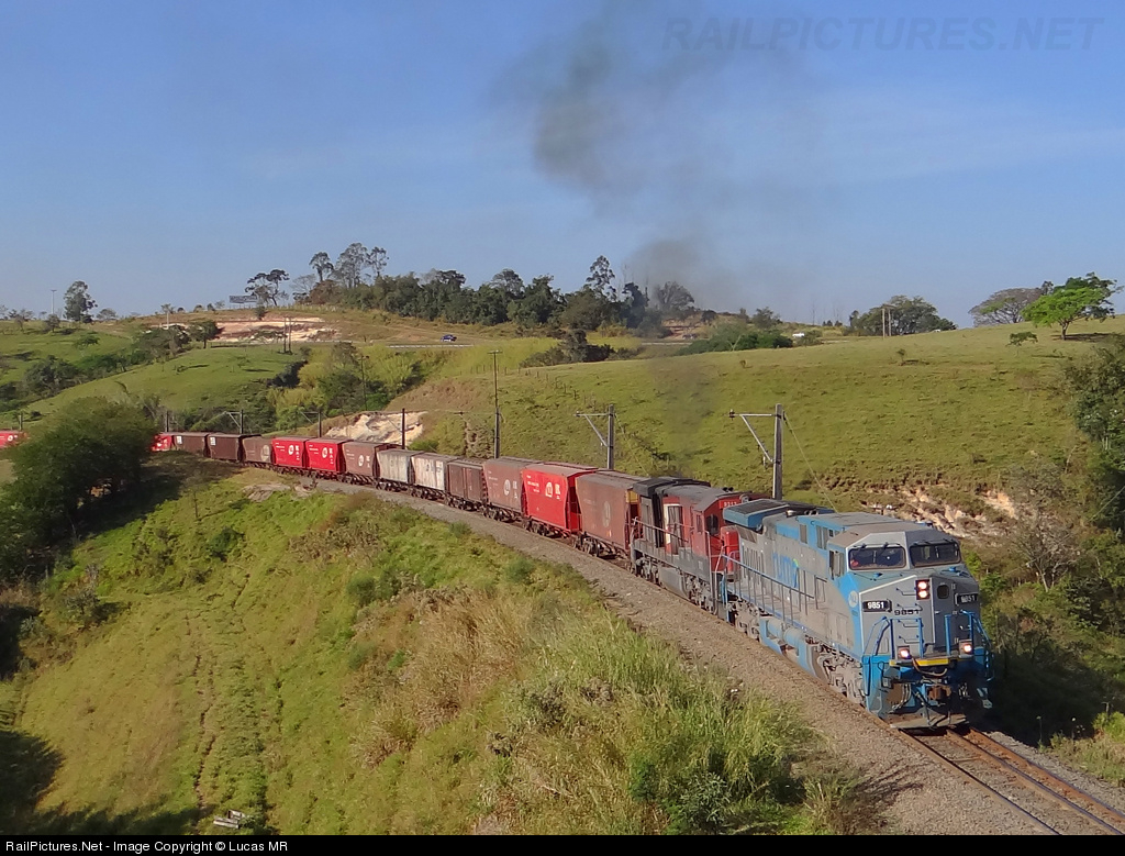 | Rumo AC44 #9851 heading a southbound train, running between the yards of Convenção and Pirapitingui, at region of Itu-SP |