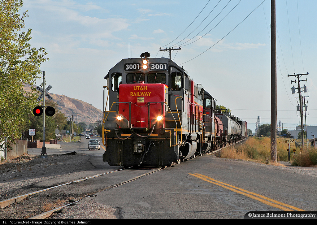 Utah Railway engineer Fred K. navigates his RUT311 local across 11th West Street in Woods Cross, Utah. Historically, this was D&RGW's Subdivision 7 mainline between SLC and Ogden. Rio Grande's Prospector passenger train crossed this same diagonal intersection at speeds approaching 70 mph! Today it's but a five mile spur from North Salt Lake that dead ends at the Holly Refining Company at 5th South.