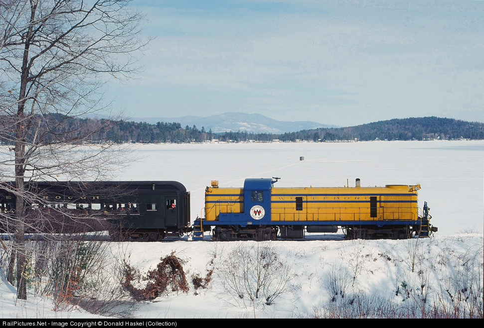 In 1976 the Wolfboro RR, a steam tourist line in eastern NH, had just taken over service on former B&M trackage north out of Concord, NH to Laconia and Lincoln, NH. This is a passenger train, operated over its new Central Wolfboro Division for local dignitaries, current customers and new prospect. Earlier accident damage to short hood end necessitated borrowed steam loco headlight. Photographer Ken Patton takes use back in history to a line currently operated by The Winnipesaukee Railroad. This train runs near the area of Governor Romaine’s summer home and is famous for the annual Thanksgiving Hart’s Turkey Farm diner train.