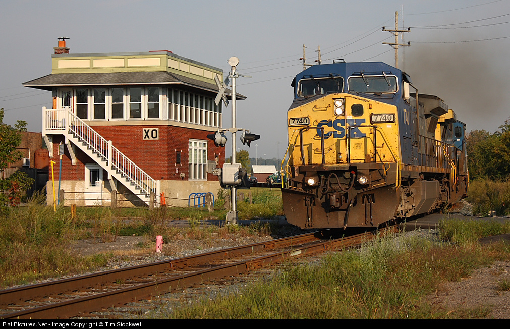 CSXT C40-8W #7740 leads CP Train 618 (a loaded sludge train) past old XO Tower in Mechanicville, NY. This sludge train originated at Fort Edward, NY where the Hudson River is being dredged of PCB-contaminated riverbed. The river sludge is enroute to Texas. XO Tower, once responsible for controlling movements in and out of the joint B&M/D&H yard in Mechanicville, is in the process of being restored as a visitor center (note the new windows and staircase).
