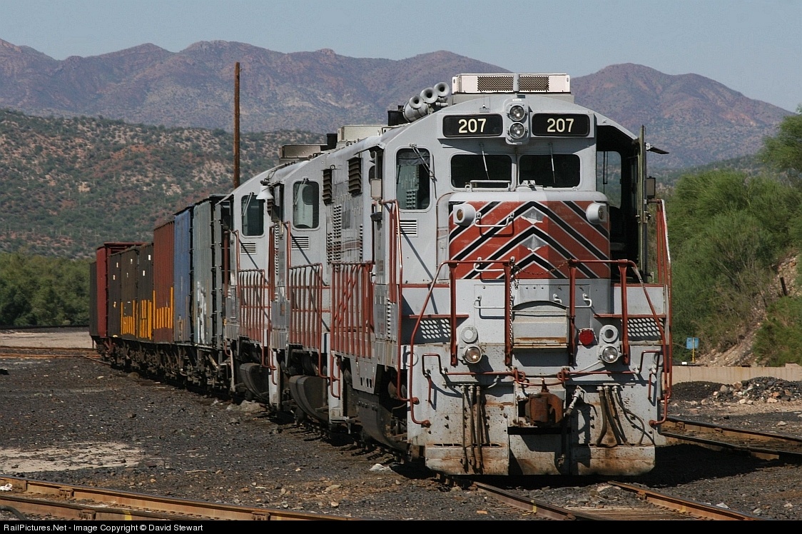 | CBRY GP9 207 and two GP18s stand at the carries shops in Hayden, Az. awaiting the 16:00 call for the "Unit Train" The set worked the local to Florence and return the previous day. Photo taken with permission.