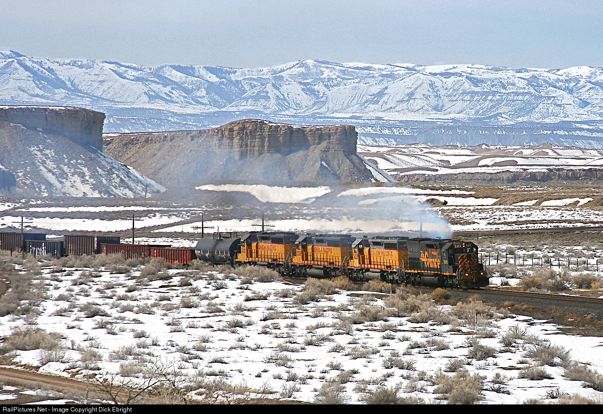 | It had to happen sooner or later. The last run of the last "pure" unpatched and un renumbered D&RGW unit on the Union Pacific. Fittingly it was on the Dirt Train local out of Helper, Utah. My friend, Jim Belmont and I knew the end was drawing close for the 5371 and had made plans to meet and shoot it before it was too late. We did not know that we would be shooting the very last run for 5371. Here it is leading 3 UP stablemates between Wash and Mounds in eastern Utah. At Mounds it will leave the Green River Sub and enter the Sunnyside branch for the steep trip up to the East Carbon Development hazardous waste landfill. |
