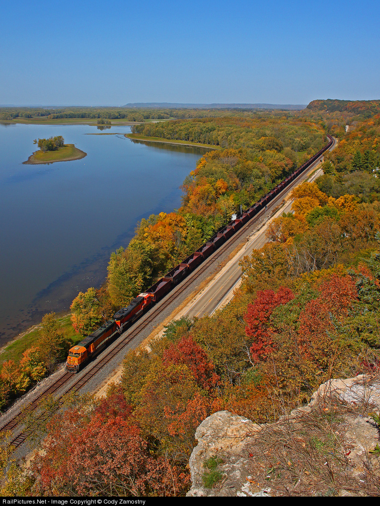 Fall peak along the Ol' Miss! A loaded ore train works eastbound down the Palisades on a perfect autumn day.