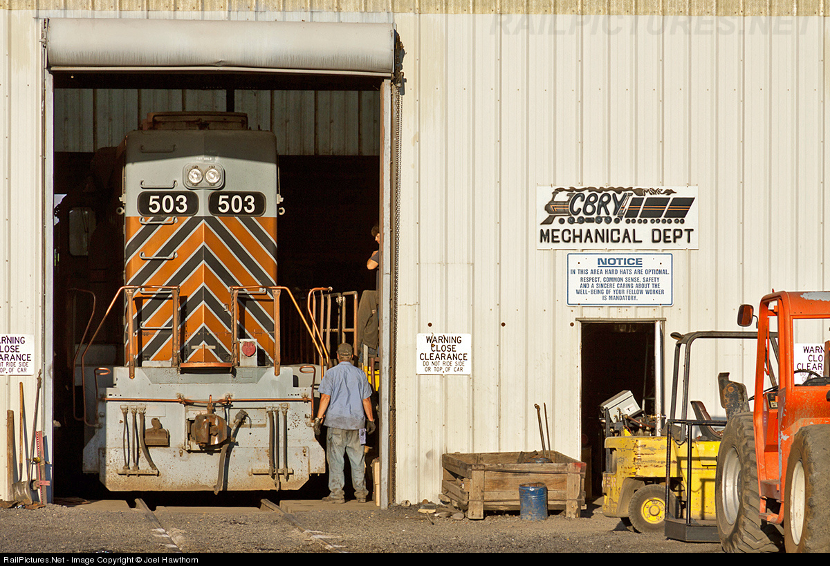 | On a guided tour of the yard and shops to start the morning and a day of railfanning of this professionally-run shortline operation. A mechanic looks over the 503 which was cold in the house for repairs. |