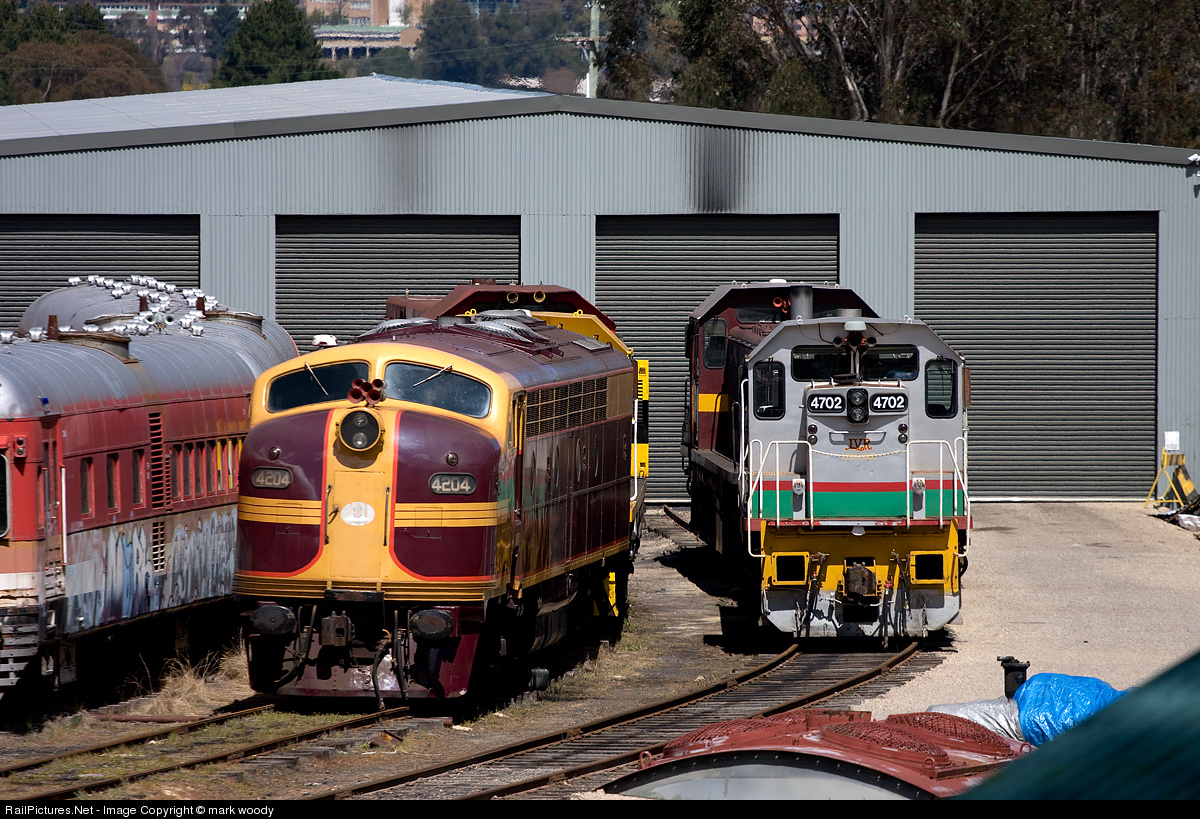 A collection of Lachlan Valley Railway locos, operated by SSR sit in front of The State Mine Railway Museum shed in Lithgow, SSR locos are serviced here among preserved rollingstock on the outskirts of Lithgow. note the EMD roof fans bottom right and part of the town of Lithgow in the background.
