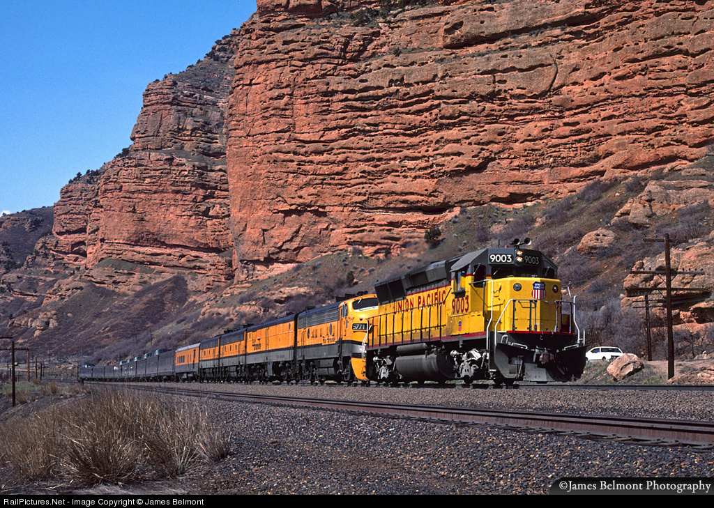 The Rio Grande Zephyr is pictured departing Utah for Denver, Colorado . . . via the Union Pacific Overland Route! The developing Thistle landslide closed the D&RGW mainline the previous evening, requiring the Rio Grande to secure trackage rights to detour the eastbound RGZ through Wyoming. Here train #18 makes a once in a lifetime appearance on UP's Evanston Subdivision through Echo Canyon on April 15, 1983. The UP 9003 (EMD GP40X) is providing the required cab signals to lead the train back home to Denver. The RGZ would make its final run between Grand Junction and Denver on April 24, 1983.