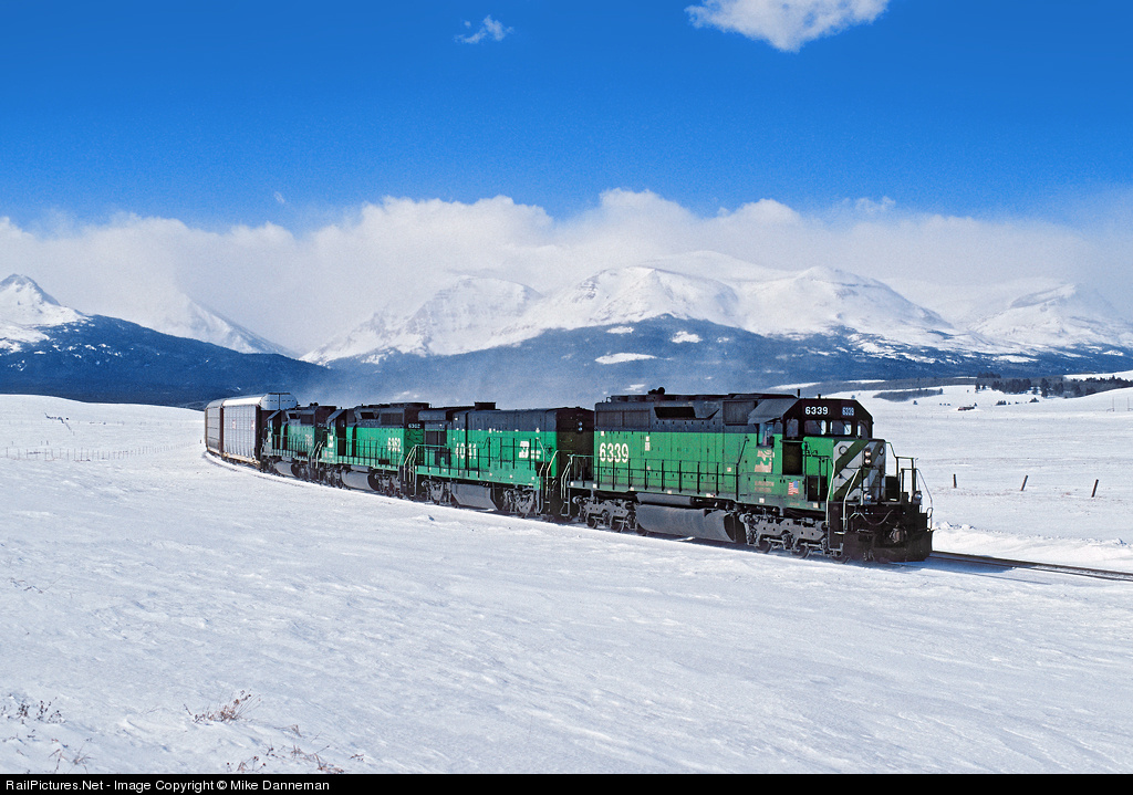 Burlington Northern Santa Fe train 14 heads east through the snow at Grizzly, Montana, on February 28, 1997. The railroad still looks like the Burlington Northern at this date, right down to the former Colorado & Southern SD40 No. 6339 leading the train. The snow-covered mountains of Glacier National Park dominate the background.