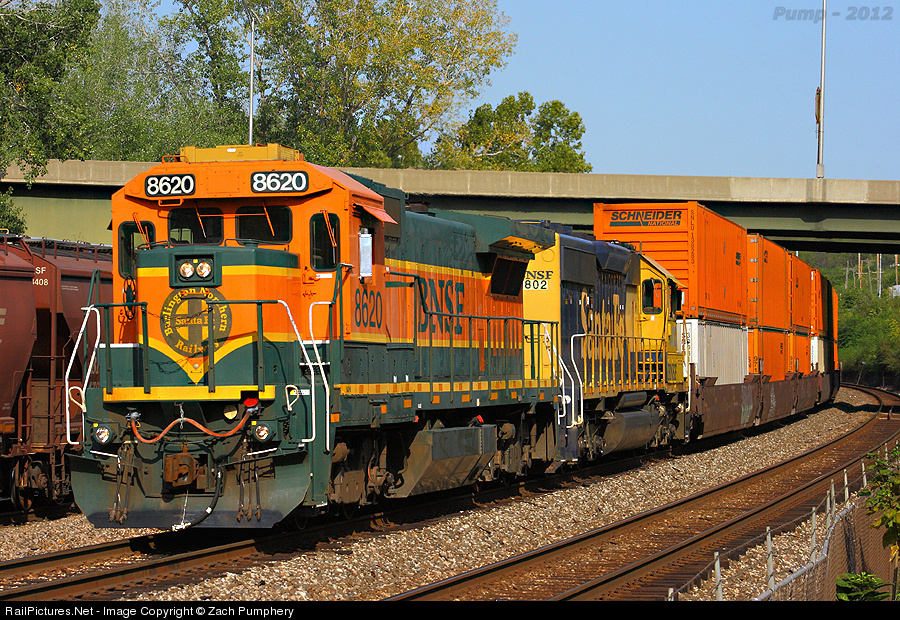 The KCS Flyer, BNSF Train Y KCK1111 29T passes under US Highway 169 led by an Ex-ATSF B40-8, which was recently reactivated after 3 years of storage. This transfer comes out of BNSF Argentine Yard, swaps blocks of Schneider Containers at KCS Knoche Yard, and returns. September 29th was Railroads Illustrated DINA 2012.
