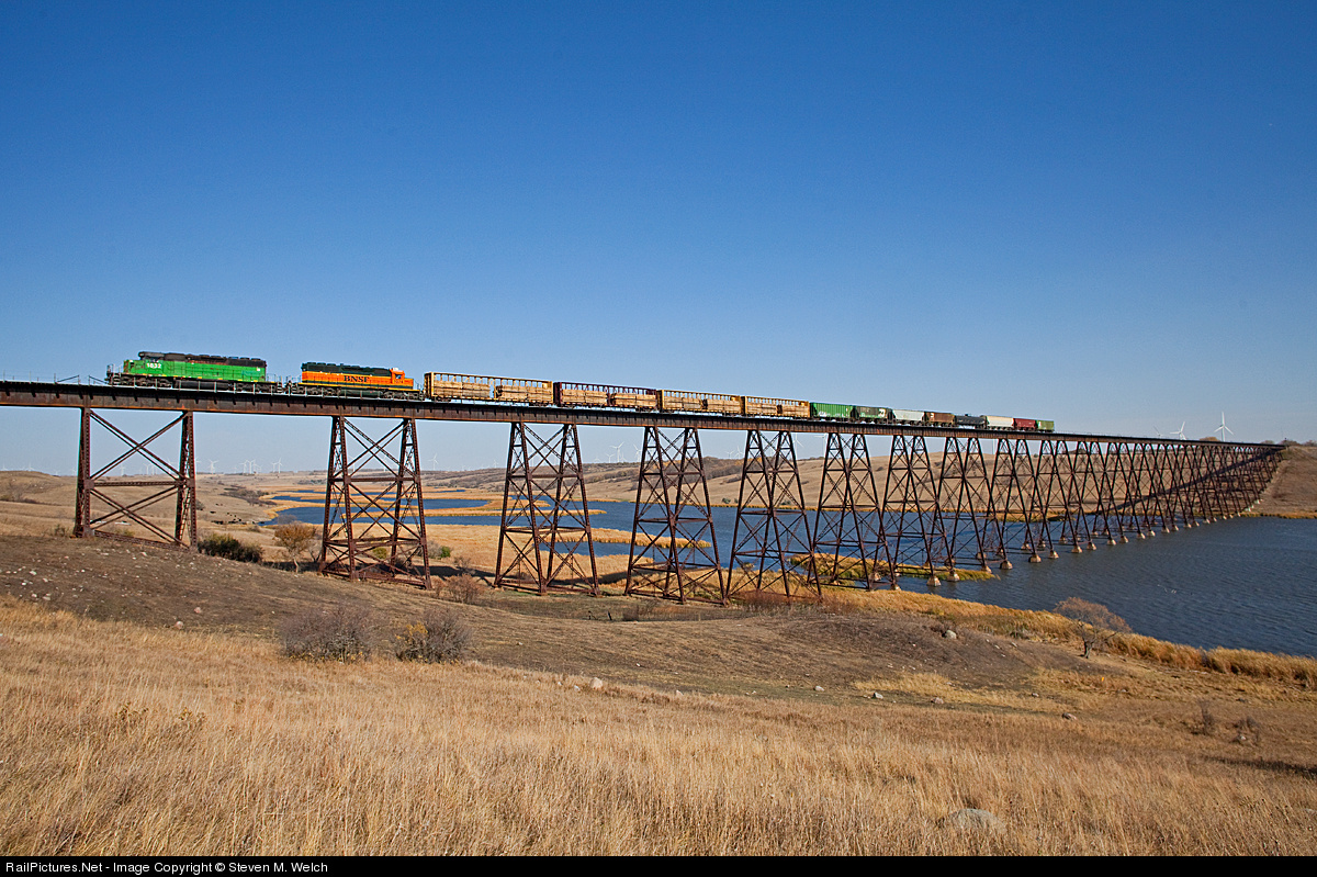 BNSF's Grace City Local rolls West with a short train over the spectacular trestle in Luverne.