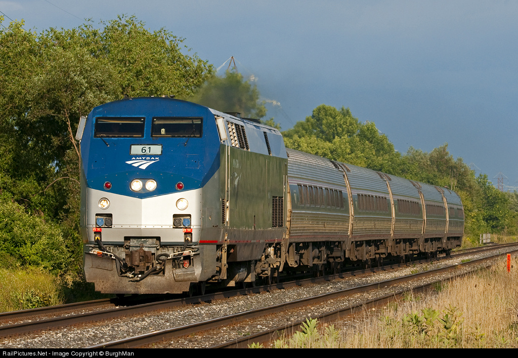 | With a storm front moving in, the joint AMTRAK/VIA Maple Leaf accelerates after stopping at Grimsby on its New York to Toronto run. |