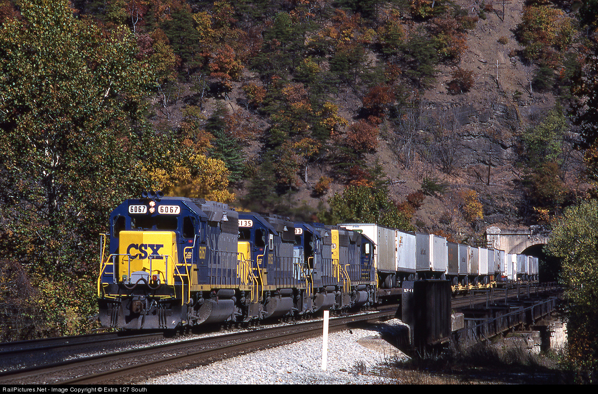 On a crisp Oct. 23, 1993, westbound CSX R135 was exiting Graham Tunnel and crossing the Potomac River from Maryland into West Virginia with four GP40-2s. Looking in the background at that code line up over the mountain makes me think about all the admiration I have for Signal Maintainers. I have yet to figure out how they get there under ideal conditions, much less in the dark of night, foul weather or both. I remember years ago speaking to a Maintainer here that relayed a story from some years before. One winters night, he tried to use the phone at Magnolia and found it was dead. He walked across the bridge at Magnolia, through the tunnel, and across the bridge here at Kesler. Upon hitting the ballast deck section, he thought he was off the bridge and took an immediate right. Mistake. He fell thirty some feet to the ground. Fortunately, daybreak came soon and a westbound saw him laying down in the snow that had broken his fall. They stopped, summoned help, and he got away with a broken collar bone.