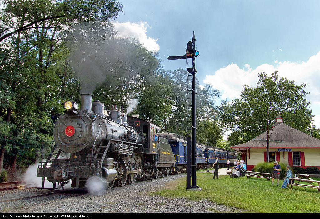 | Wilmington and Western #58 prepares for a day's excursion departing Greenbank Station. A scene seen by many yet rarely photographed due to the difficult nature of the lighting encountered here at the depot. Still, a treat for all who ride along the right of way of this historic and spectacularly scenic railroad. Click here for more information about the W&W. |