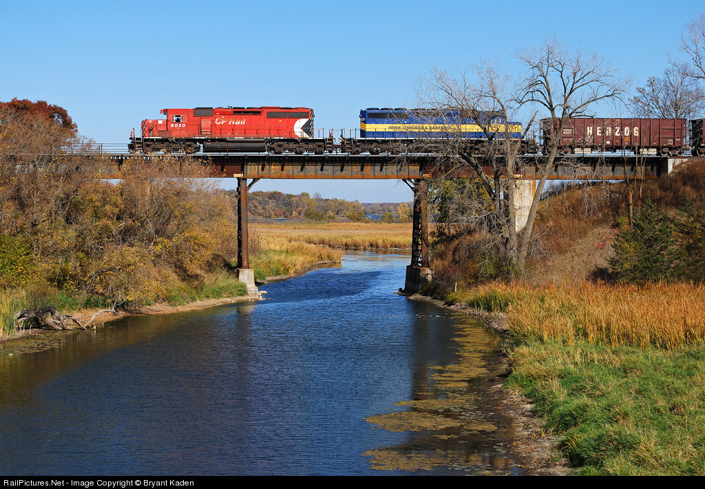 Two SD40-2s lead a ballast train across the steel bridge east of Paynesville, MN. With their work for the day completed, they'll utilize the Paynesville siding to run-around their train, then head back east toward Minneapolis.