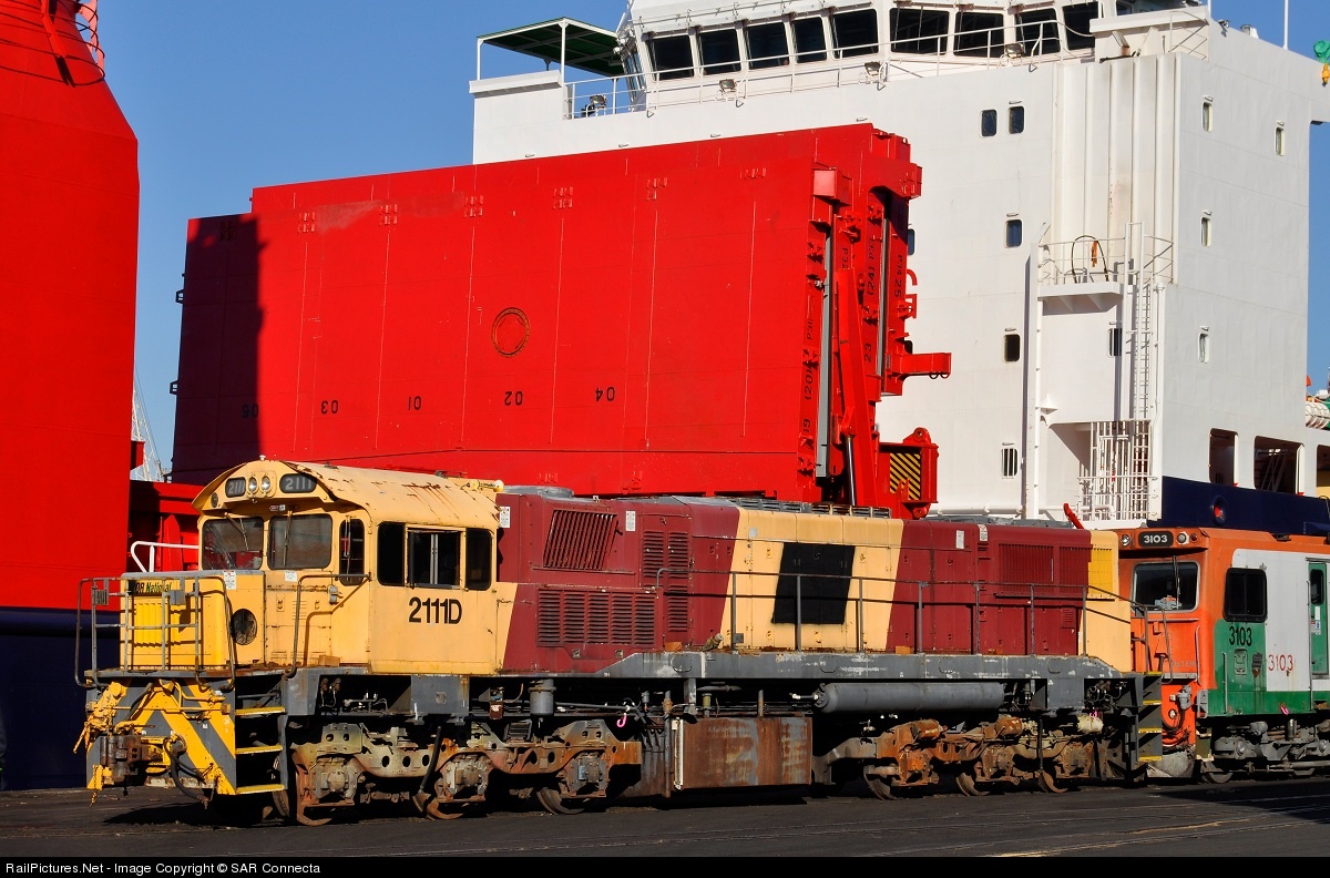 A consignment of ex QR National locomotives were shipped to South Africa in June 2012 for various rail companies. This is 2111D shortly after being craned off the "Clipper Amber".