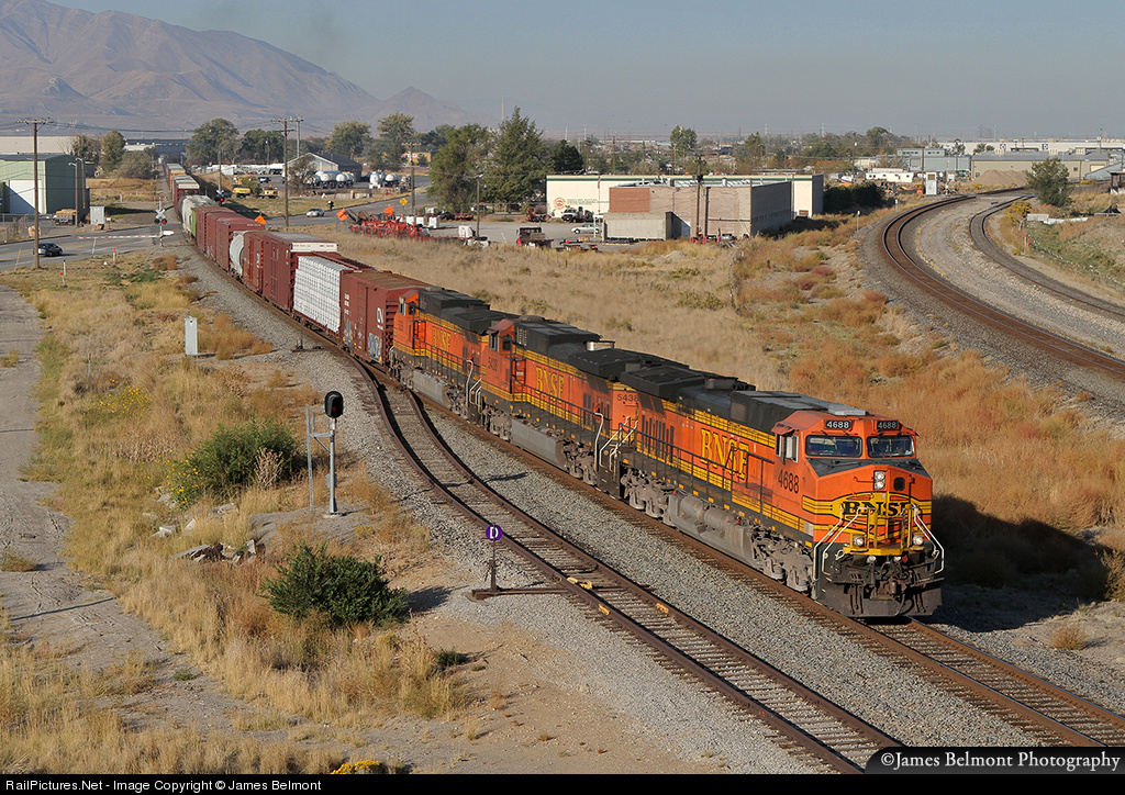 A BNSF Railway trackage rights manifest from Stockton, CA arrives in Salt Lake City via Union Pacific's Lynndyl Subdivision at Buena Vista. The train will change crews at Roper Yard with a Utah Railway crew forwarding the 79 car manifest to Provo Yard, its final destination. BNSF's trackage rights agreement on the UPRR between Denver, CO and Stockton, CA has been in effect for 16 years, since the UP-SP merger on Sept. 11, 1996. The two tracks veering off to the right are the former Western Pacific mainline to Oakland and shortline operator Salt Lake Garfield & Western's route to the Salt Lake International Center business park west of the airport. In the middle background above the trees is Kennecott Copper's smokestack. At 1,215 feet in height, it is the tallest free-standing structure west of the Mississippi River, the fourth tallest smokestack in the world and the thirty-third tallest free-standing structure on earth.
