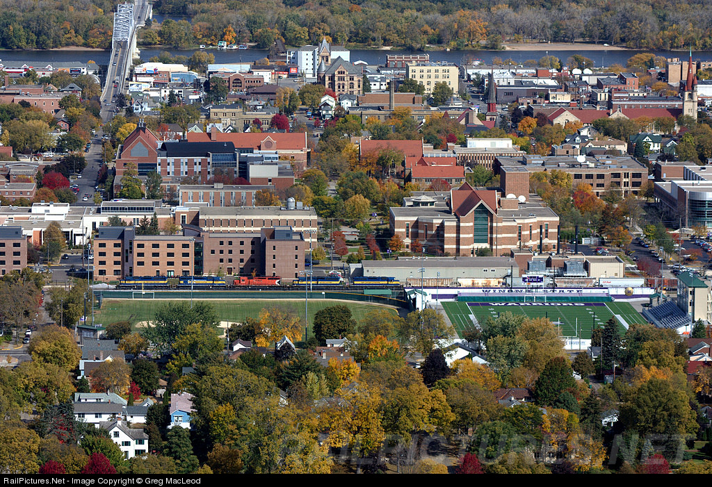 | A five pack of SD40-2s rolls through the Winona State University campus in Winona, MN. A portion of the long abandoned C&NW bridge across the Mississippi River can be seen just to the right of the highway bridge at the top left. |