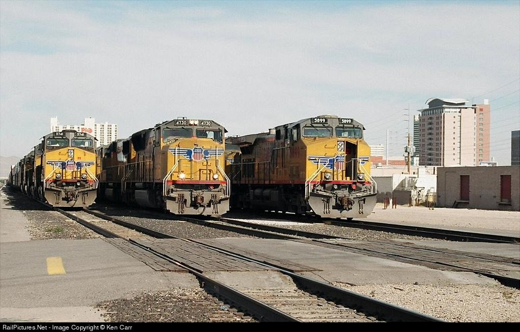 | UP 4730 a westbound stack leaves Las Vegas, as UP 5741 sits dead, UP 5899 waits for a crew. Rebel TI, 200 ASA, 24-80mm Sigma lenses |