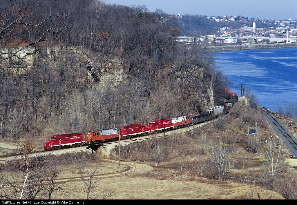Chicago Central and Pacific westbound freight No. 51 leaves Dubuque, Iowa, in its background on March 10, 1991. On the right is the Soo’s former Milwaukee Road main line down the river. Up front on this train is GP10 No. 1749, and second out is a somewhat rare, unrebuilt, former Illinois Central Gulf GP9 that still has its high nose (rare at least by this date anyway).