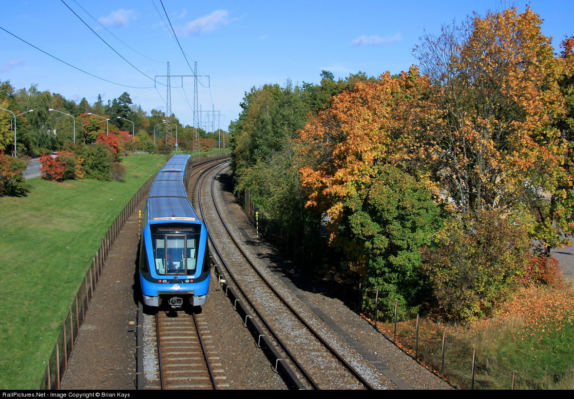 | A northbound Stockholm Tunnelbanan train led by #2096 travels past through the Sätra neighborhood in southwest Stockholm in amongst a pleasant fall day. This route is a part of the "red line" and extends from Norsborg in the southwest to Rapsten in the northwest via T-Centralen. |