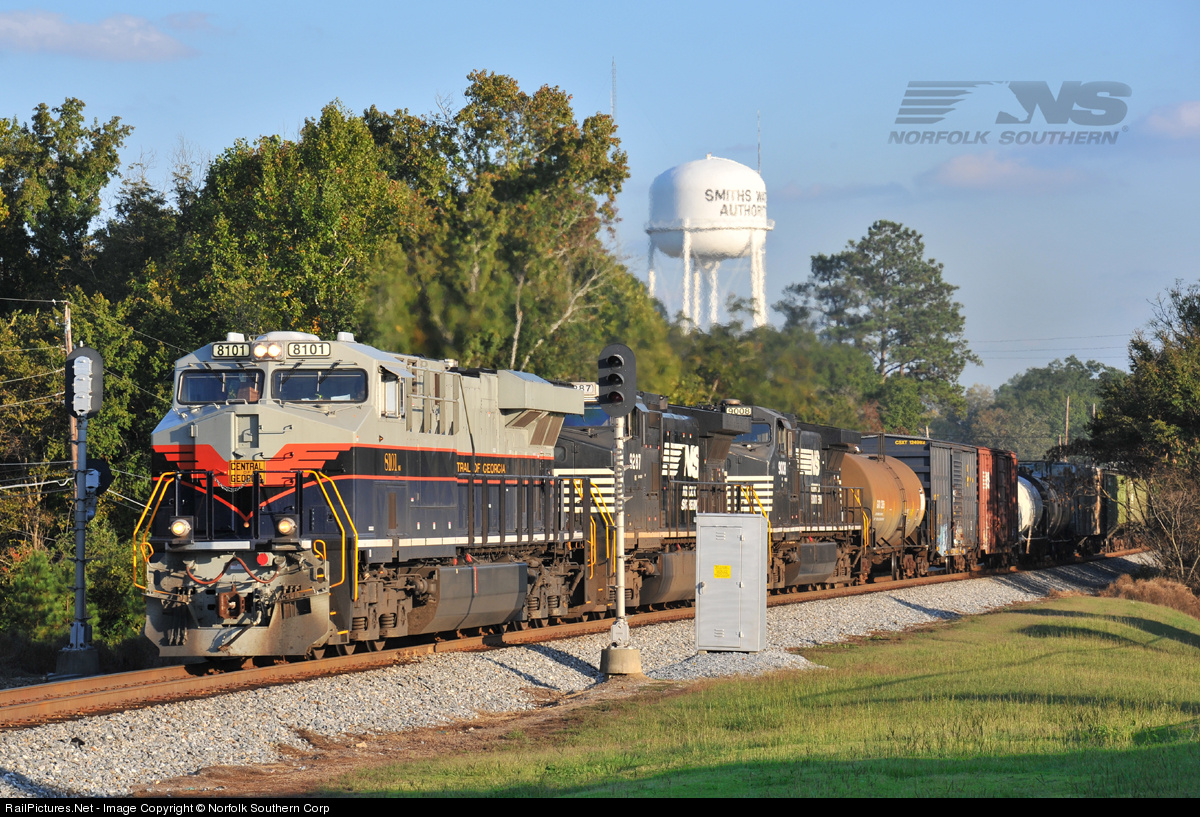 | The Central of Georgia heritage unit leads train 137 west through Smiths Station along the former Central of Georgia mainline towards Birmingham. Photo by Casey Thomason. For more information, visit www.nscorp.com |