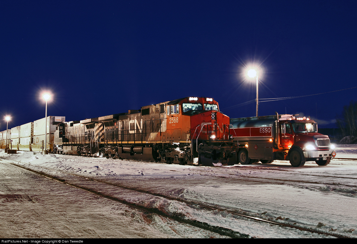 Typical northern railroading: An ESSO truck refuels 2568 at Capreol while train 112 gets a new crew. The temperature is well below 35 Celsius.