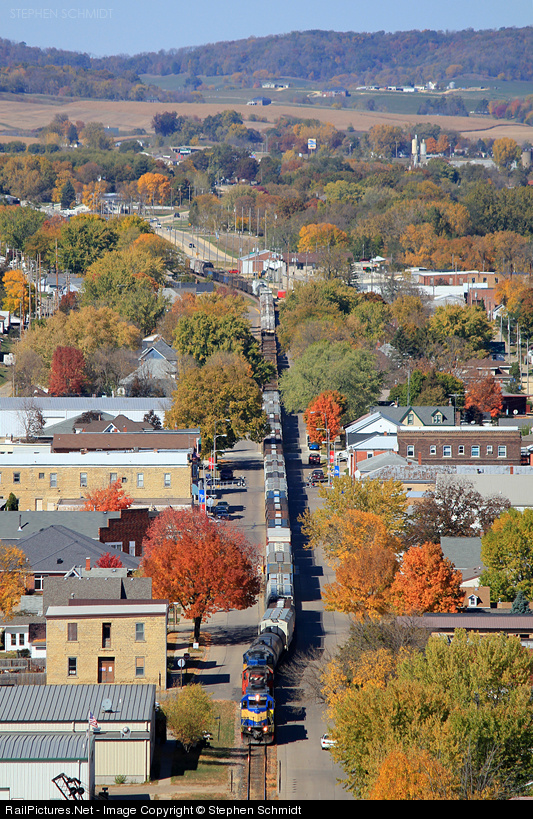 DM&E 6050 leads an early and lengthy train 270 through the middle of Bellevue, Iowa. The hills of the Mississippi River valley are alive with color and the blue and gold of today's leader just add to their splendor.
