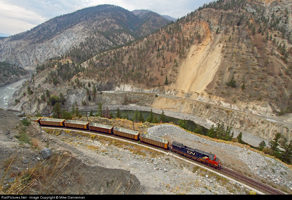 The impressive view from Skihist Provincial Park near Lytton, British Columbia, provides a great view of a Canadian National empty sulphur train led by GE C44-9W No. 2567 headed eastbound on Canadian Pacific tracks. Across the Thompson River Canyon is home rails of CN, which seem to have some issues with the mountain sliding off onto the right-of-way. Directional running expedites trains through the Fraser and Thompson Canyons, with the CP transporting eastbounds, and CN the westbounds.