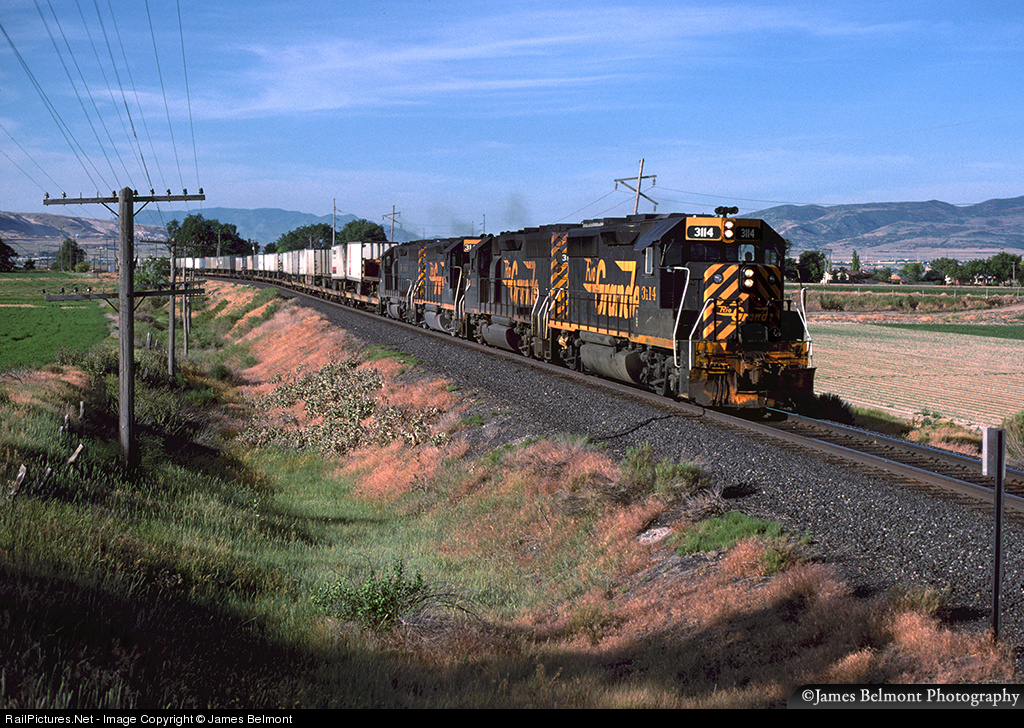 One of the hottest trains on the Rio Grande in the mid to late 1980s were the 'Railblazer' sprint trains, #102 and #103. Here the westward variant is about 12 miles from the end of its 570 mile overnight journey from Denver. The ensuing 24 years have brought numerous changes to this landscape with businesses, homes, grade separation, and commuter rail altering what used to be a rural farming community.