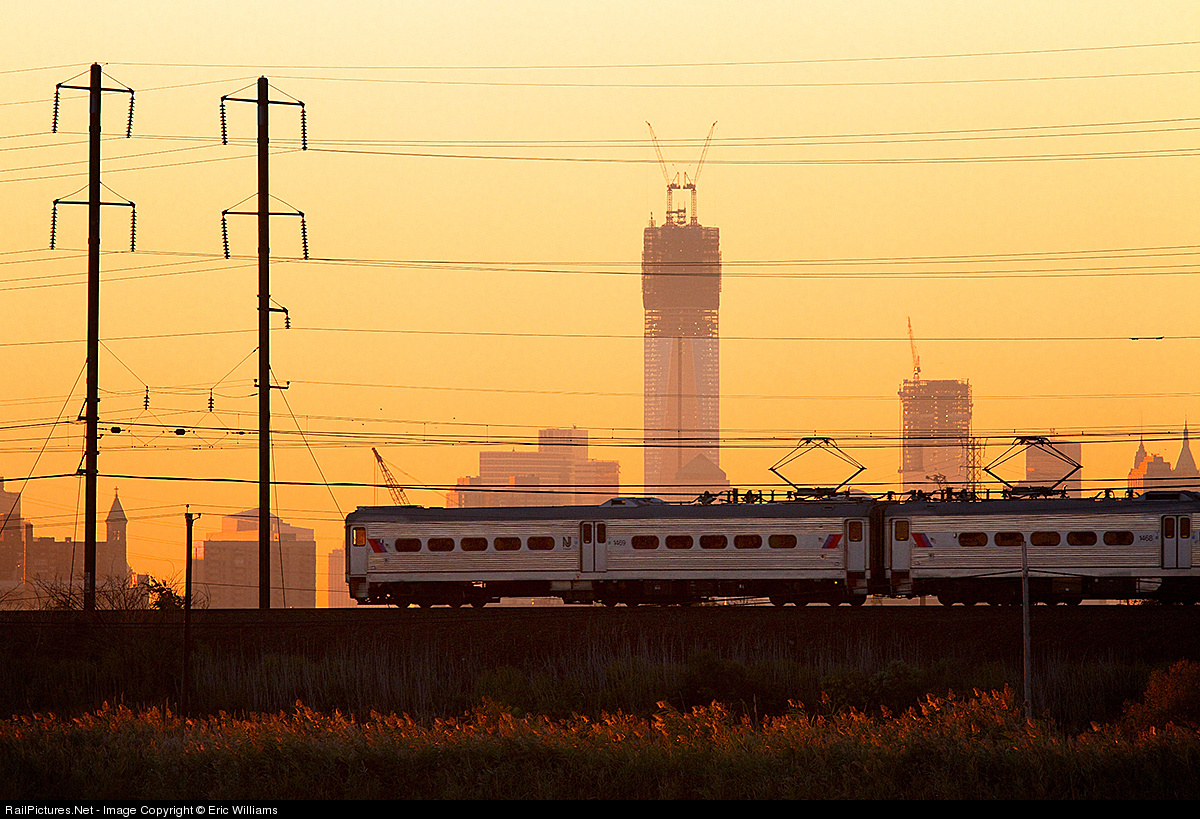 Heading towards New York City with a load of commuters, this set of NJ Transit Arrow III multiple unit motors whisks by the rising Freedom Tower.