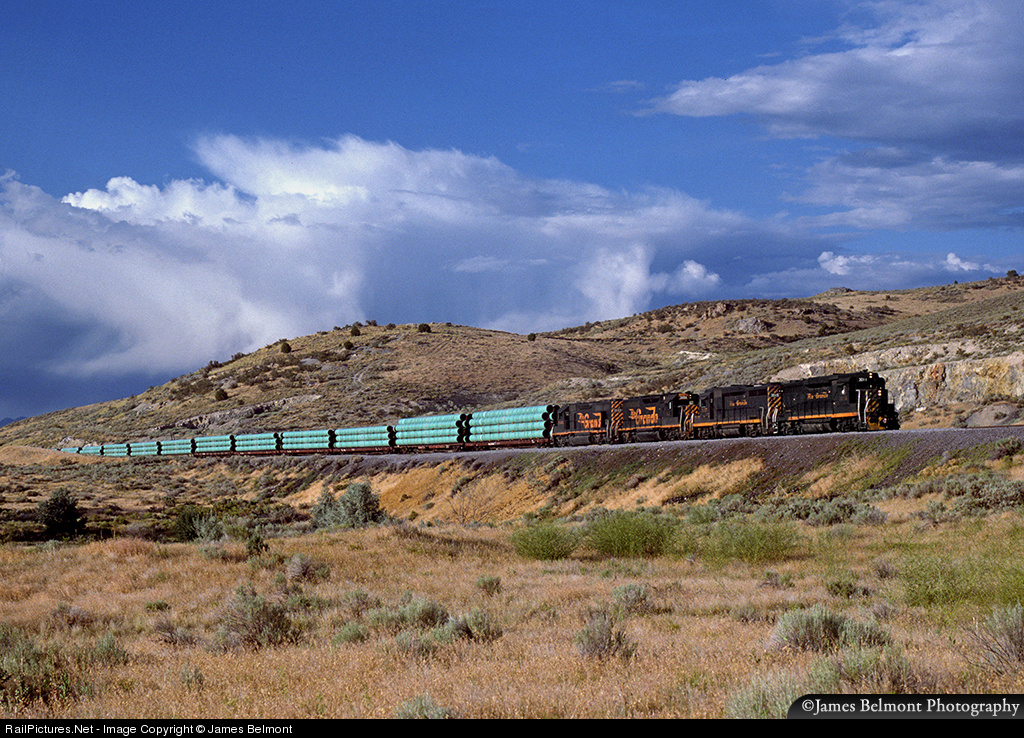 The Rio Grande hauled several carloads of pipe for a natural gas pipeline project for Kern River in Utah's Goshen Valley. A pair of GP30s and two GP40s haul the heavy train along the foothills of Warm Springs Mountain in Genola. The cars would be unloaded and transferred to trucks on the passing siding at Elberta.